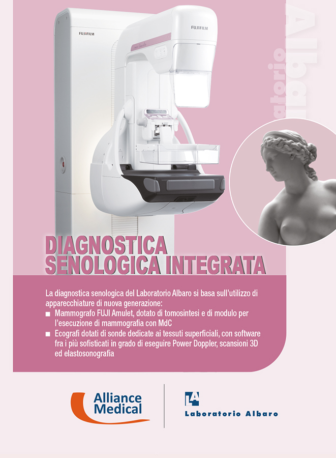 Il Laboratorio Albaro fornisce uno screening senologico integrato effettuabile in giornata.Mammografia Ecografia mammaria Risonanza magnetica Agoaspirato e TRU CUT per diagnostica cito-istologica Diagnosi precoce delle lesioni della mammella Diagnostica di laboratorio e marcatori tumorali specifici Visita clinica senologica conclusiva con eventuale indirizzo terapeutico Visita chirurgico-plastica per la prevenzione e correzione di dismorfismi mammari pre-esistenti e post-chirurgici